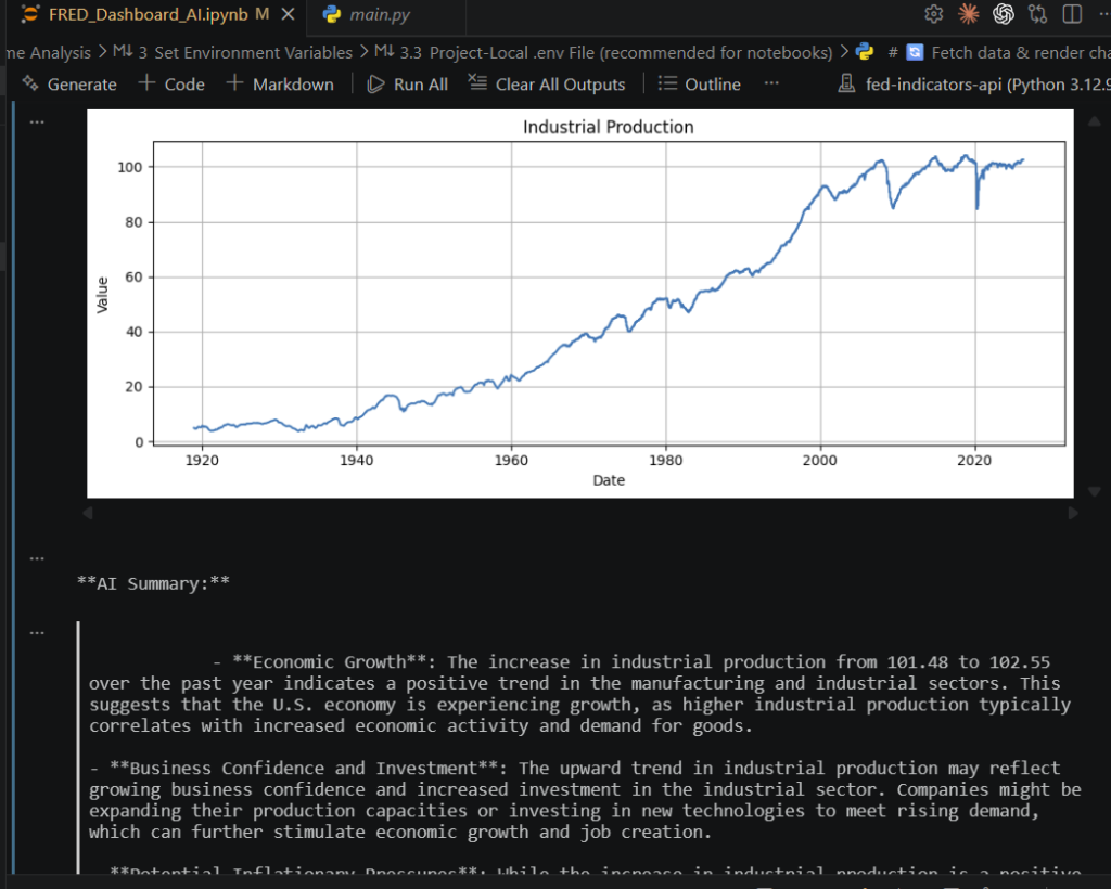 I decided to code this in a Jupyter Notebook because it supports graphics, markdown, and code. It’s also fairly easy to enter your AI’s API key. For this implementation, the program uses OpenAI’s GPT-4o model exclusively to generate plain-language, real-time commentary on each indicator. It is a simple idea with the potential to significantly inform anyone who wants to stay up to date on the economy without a degree in economics.